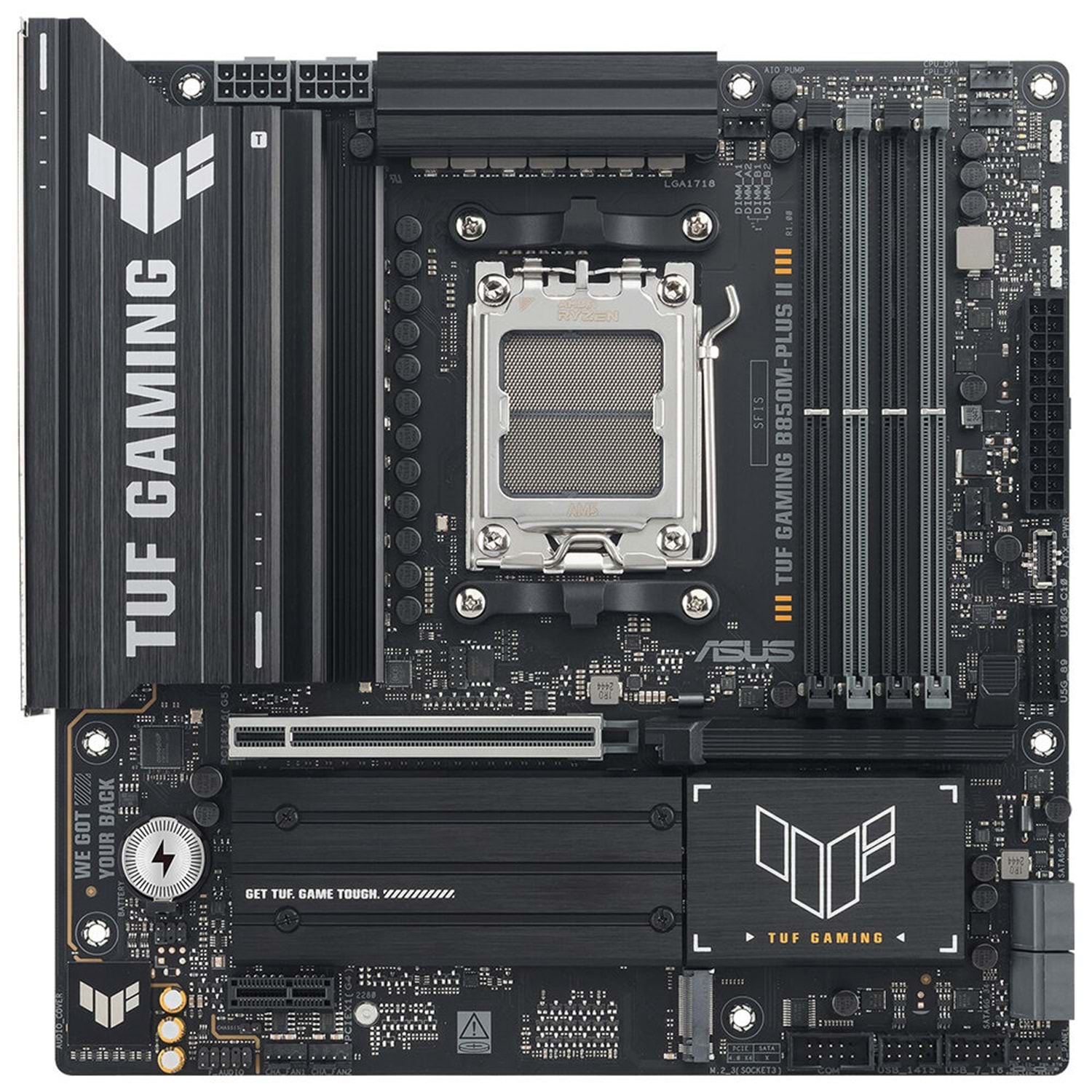 ASUS TUF GAMING B850M-PLUS II, en yeni AMD Ryzen™ işlemcilerinin en önemli unsurlarını alıp oyunlara yönelik özellikler ve kanıtlanmış dayanıklılıkla bir araya getirir. Askeri sınıf bileşenler, gelişmiş güç çözümü ve kapsamlı soğutma sistemiyle donatılan bu anakart, oyun maratonları için kararlı ve sağlam performans ile beklentilerin ötesine geçer. TUF GAMING anakartlar, diğerlerinin başarısız olabileceği koşullarla başa çıkabilmek için zorlu testlerden geçirilir. Bu platform, gelişmiş yapay zeka bilgisayarlarına ait uygulamaların talep ettiği güç ve bağlantıları ortaya koyar.