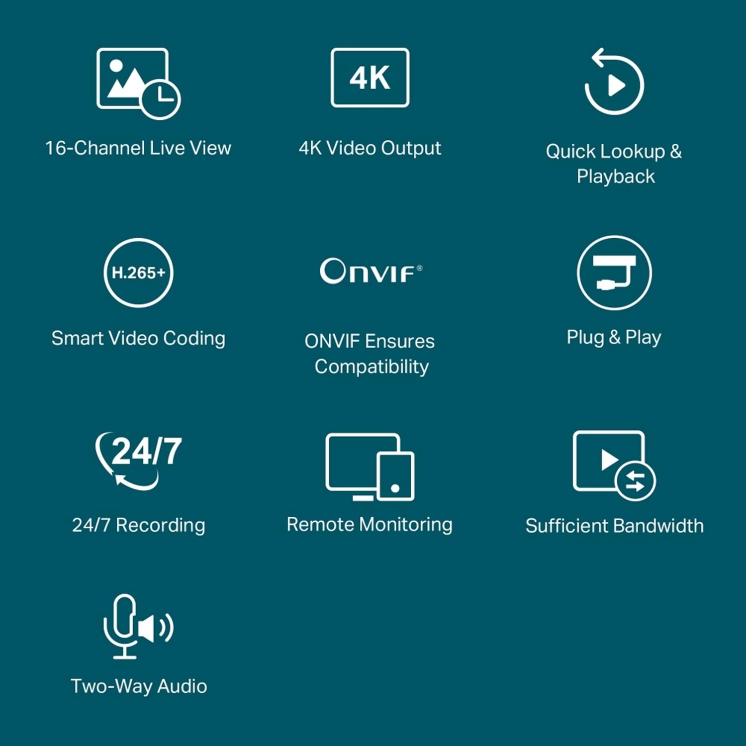 2ch*8MP/16ch*1MP,1×SATA(10TB), 1xESATA, 1×HDMI, 1×VGA, 100Mbps LAN, Alarm, Çift Yönlü Konuşma, ONVIF, PC/mobil APP, Cloud, web
