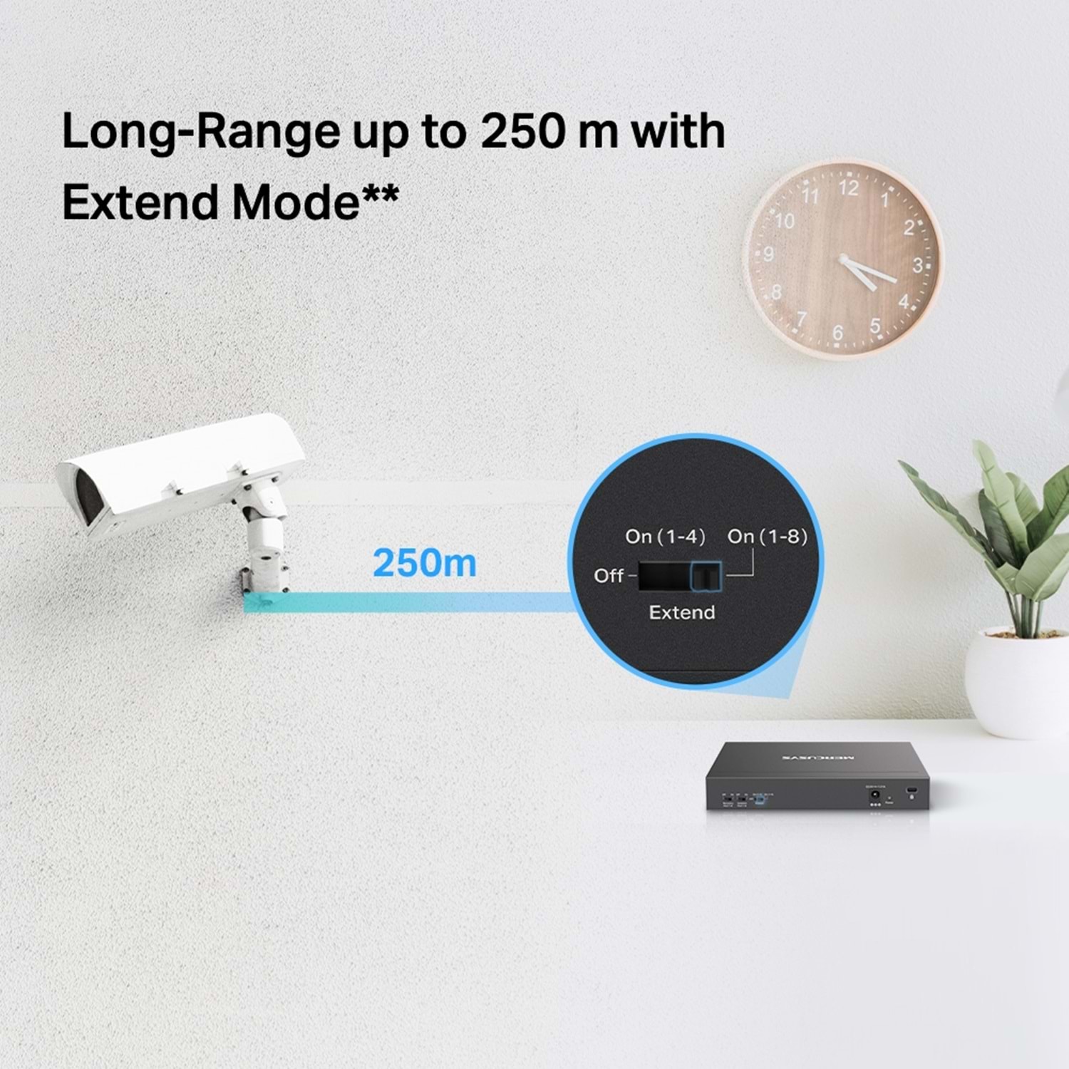 250 m'ye kadar Uzun Menzil: Uzatma Modu* ile PoE iletim mesafesini 250 m'ye çıkarır.